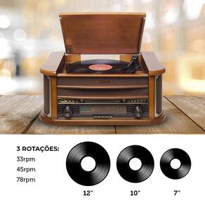 - Alimentação: Bivolt - Bateria: Não - Rotações: 33, 45 e 78 RPM - Potência: 10W RMS - Peso: 8,8kg - Dimensões do produto (LxAxC): 35x21x49cm - Dimensões do produto com a tampa toda aberta (LxAxC):35x46x49cm - Garantia: 1 ano - Controle remoto: Sim - Tipo de tração: beltdrive - Mecanismo automático: Sim - Possibilidade de troca de agulha: Sim (agulha de safira) - Sistema anti-impacto: Não - Sistema de contrapeso: Não - Compatibilidade com amplificador externo: Sim - Entrada para fone de ouvido: Sim - Não é possível converter do Vinil para k7 ou para CD, apenas para o Pen Drive.