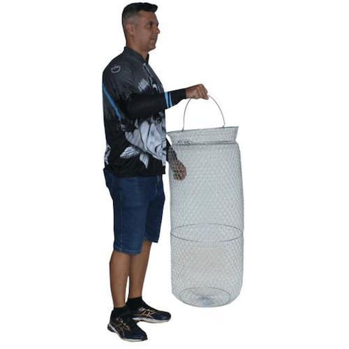 O cesto de pesca é o equipamento que não pode faltar na sua pescaria, sua estrutura de metal o torna muito mais resistente e durável, e além do mais ele conta com diversas utilidades que o tornam muito mais prático, ele possui uma alça na qual você pode deixar o cesto preso dentro da água para conservar os peixes ou então carregar o mesmo, sua estrutura é desenvolvida de modo que é possível fechar o cesto por completo, deixando-o mais prático na hora de transportar, nas suas pescarias você não vai mais passar sufoco, pois o cesto de pesca conta com uma porta com fechamento por mola que só abre para dentro ou seja, seus peixes não vão nunca mais fugir. Adquira agora mesmo o cesto de pesca e tenha muito mais praticidade e segurança nas suas pescarias.