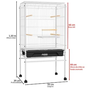 Características Principais: - Comprimento: 59 cm - Altura: 110 cm - Profundidade: 39 cm - Altura do viveiro sem os pés somente o corpo : 66 cm - Malha larga de 17mm para máxima segurança. - 4 poleiros para exercício e descanso. - 2 Comedouros plástico - Bandeja plástica removível para fácil limpeza. - Porta com poleiro para acesso fácil e diversão - Construção durável com arame BTC e pintura epóxi branca. Ideal para Diversas Espécies de Aves: Este viveiro é projetado especificamente para atender às necessidades das ring necks, calopsitas e papagaios, proporcionando-lhes um espaço seguro e acolhedor para viver e explorar. Marca: Gaiolas Quatiguá