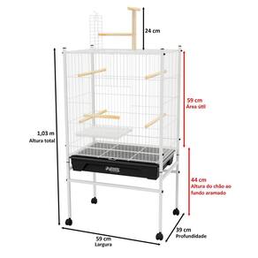 Proporcione um ambiente seguro e confortável para suas preciosas calopsitas, ring necks e papagaios com o nosso Viveiro de Malha Larga para Aves de Médio Porte. Com medidas ideais e uma construção robusta, este viveiro oferece o espaço perfeito para que suas aves possam voar e brincar com liberdade. Na parte superior, o viveiro apresenta um teto com abertura, equipado com um poleiro adicional para proporcionar mais opções de exercício e entretenimento para suas aves. Características Principais: Comprimento: 59 cm Altura: 110 cm Profundidade: 39 cm Altura do viveiro sem os pés somente o corpo : 66 cm Malha larga de 17mm para máxima segurança. 1 poleiro no teto para exercício e descanso adicional. 2 Comedouros plástico Bandeja plástica removível para fácil limpeza. Porta com poleiro para acesso fácil e diversão Construção durável com arame BTC e pintura epóxi branca. Ideal para Diversas Espécies de Aves: Este viveiro é projetado especificamente para atender às necessidades das ring necks, calopsitas e papagaios, oferecendo-lhes um espaço seguro e acolhedor para viver e explorar. Marca: Não Informado