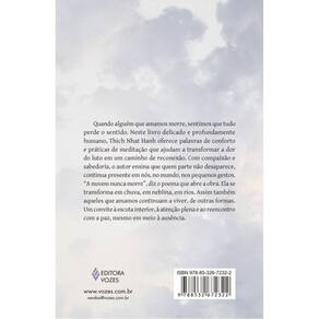 Quando alguém que amamos morre, sentimos que tudo perde o sentido. Neste livro delicado e profundamente humano, Thich Nhat Hanh oferece palavras de conforto e práticas de meditação que ajudam a transformar a dor do luto em um caminho de reconexão. Com compaixão e sabedoria, o autor ensina que quem parte não desaparece, continua presente em nós, no mundo, nos pequenos gestos. “A nuvem nunca morre”, diz o poema que abre a obra. Ela se transforma em chuva, em neblina, em rios. Assim também aqueles que amamos continuam a viver, de outras formas. Um convite à escuta interior, à atenção plena e ao reencontro com a paz, mesmo em meio à ausência.