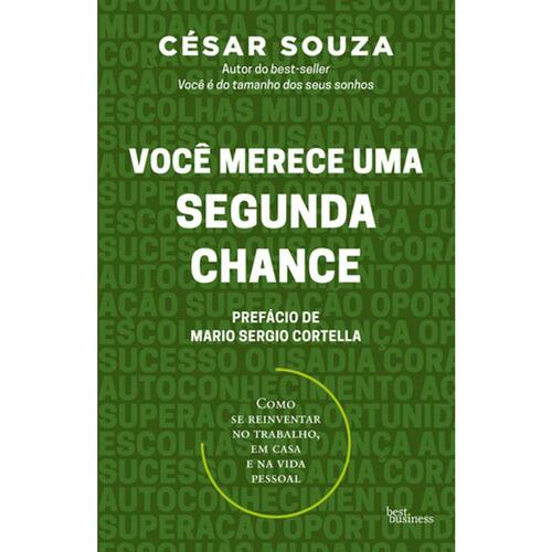 Como se reinventar no trabalho, em casa e na vida pessoal César Souza, autor do best-seller Você é do tamanho dos seus sonhos, nos convida a dar uma virada e criar uma nova chance na carreira, no amor, na escola, na qualidade de vida, na saúde e na cidadania. E estimula as empresas a se reinventarem continuamente. Você merece uma Segunda Chance aborda de forma inovadora e corajosa a trajetória para o redescobrimento de cada um e estimula o leitor a acreditar na sua capacidade de transformação. Por meio de relatos de pessoas e cases de empresas vencedoras, ensina a se reinventar no trabalho, em casa e na vida pessoal a fim de identificar as oportunidades de mudança; permitir-se uma Segunda Chance, preparar-se para a decolagem e fazer acontecer na hora da verdade.