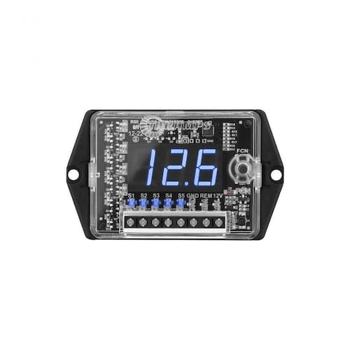 Voltimetro Digital Taramps Vts 5.1 O VTS 5.1 vai muito além de monitorar a ?Voltagem? das baterias. Com 5 saídas sequenciais para acionamento do sistema de som, ele possui alertas e proteções contra tensão alta e baixa, registro de tensão mínima (HOLD) e modo SPL (permite funcionar em sistemas acima de 16V). Tudo isso e muito mais, com o menor consumo e custo benefício do mercado. *Imagens meramente ilustrativas. DIMENSÕES (LXAXP): 88 x 19,5 x 53mm PESO: 0,1 Kg Range de Medição: 6V ~ 30V DC Consumo em Stand-By: 0,1mA Consumo Nominal (Ligado): 100mA Número de saídas do sequenciador: 5 Capacidade da saída do sequenciador: 150mA Proteção de bateria baixa: 9V (Saídas de S1 à S5 são desligadas) Indicação de bateria baixa: Quando a bateria está abaixo de 10,2V o display pisca Proteção de bateria alta: Desliga as saídas S1 a S5 quando a voltagem excede 16,5V (padrão) ou 19,5V (Modo SPL) O VTS 5.1 vai muito além de monitorar a ?Voltagem? das baterias. Com 5 saídas sequenciais para acionamento do sistema de som, ele possui alertas e proteções contra tensão alta e baixa, registro de tensão mínima (HOLD) e modo SPL (permite funcionar em sistemas acima de 16V). Tudo isso e muito mais, com o menor consumo e custo benefício do mercado. *Imagens meramente ilustrativas. DIMENSÕES (LXAXP): 88 x 19,5 x 53mm PESO: 0,1 Kg Range de Medição: 6V ~ 30V DC Consumo em Stand-By: 0,1mA Consumo Nominal (Ligado): 100mA Número de saídas do sequenciador: 5 Capacidade da saída do sequenciador: 150mA Proteção de bateria baixa: 9V (Saídas de S1 à S5 são desligadas) Indicação de bateria baixa: Quando a bateria está abaixo de 10,2V o display pisca Proteção de bateria alta: Desliga as saídas S1 a S5 quando a voltagem excede 16,5V (padrão) ou 19,5V (Modo SPL) Ean: 7898556848275