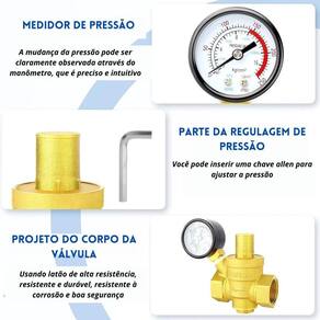 Vrp tk- 905 valvula redutora pressao latao com manometro dn 1.1/2pol Válvula redutora para agua x000d Regulagem de 1 a 16 bar 250 psi x000d Corpo em latão hpb57-3 x000d Extremidades rosca gás bsp ff x000d Saída para manômetro flp 1/4 manômetro incluído x000d Compatível com água x000d Temperatura de trabalho de -10ºc a 110ºc. x000d Pressão máxima de trabalho 10 bar pn16 . x000d A válvula redutora de latão usa as peças de abertura e fechamento da válvula para ajustar o fluxo do meio, reduzir a pressão do meio e, ao mesmo tempo, ajustar a abertura da válvula pela pressão atrás da válvula, de modo que a pressão final seja mantida dentro de uma determinada faixa. no caso de alterações constantes na pressão de entrada, a pressão de saída é mantida dentro da faixa definida para proteger os aparelhos residenciais e de produção subsequentes. x000d Função - regulação , descompressão x000d Aplicação - a válvula redutora só pode ser utilizada para a descompressão de gás limpo ou água como ar, vapor, água, que não contenha impurezas particuladas. se necessário, um filtro pode ser instalado antes da válvula redutora .