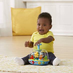 Mergulhe na diversão com o aquário learn & spin. Pressione o bico de água azul e veja-o girar, acender e tocar música. Amigos adoráveis do oceano nadam e giram no aquário enquanto as luzes piscam. Cada vez que o êmbolo é pressionado você ouvirá uma frase divertida, um som divertido ou uma melodia curta. Três botões coloridos introduzem animais, cores, números e música de reprodução. Ouça canções alegres cantadas pelo caranguejo, peixe e estrela do mar.& ; fazer um respingo com esses amigos do oceano girando!
