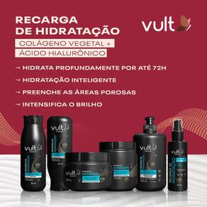 Condicionador para todos os tipos de cabelo, especialmente ressecados e secos. Vult Cabelos Recarga de Hidratação hidrata por até 72 horas, além de selar e oferecer brilho intenso aos fios.