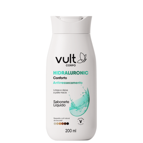 Vegano, o Sabonete Líquido Antirressecamento Vult Corpo Hidraluronic Conforto proporciona uma pele limpa, macia, hidratada e exalando perfumação onde quer que você esteja.