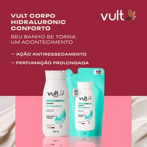 Sabonete líquido. Vult Corpo Hidraluronic Corforto Antirressecamento possui fórmula que limpa e deixa a pele macia com conforto, para um banho relaxante.