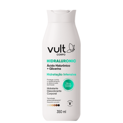 O Hidratante Desodorante Corporal Vult Corpo Hidraluronic Hidratação Intensiva proporciona hidratação para o corpo ao combinar Ácido Hialurônico e Glicerina: dois ativos reconhecidos pelo alto poder de hidratação para um cuidado intensivo com a pele.