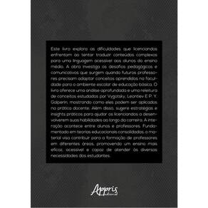 Este livro explora as dificuldades que licenciandos enfrentam ao tentar traduzir conteúdos complexos para uma linguagem acessível aos alunos do ensino médio. A obra investiga os desafios pedagógicos e comunicativos que surgem quando futuros professores precisam adaptar conceitos aprendidos na faculdade para o ambiente escolar de educação básica. O livro oferece uma análise aprofundada e uma releitura de conceitos estudados por Vygotsky, Leontiev E P. Y. Galperin, mostrando como eles podem ser aplicados na prática docente. Além disso, sugere estratégias e insights práticos para ajudar os licenciandos a desenvolverem suas habilidades ao longo da carreira. A interação acontece entre alunos e professores. Fundamentado em teorias educacionais consolidadas, o material visa contribuir para a formação de professores em diferentes áreas, promovendo um ensino mais eficaz, acessível e capaz de atender às diversas necessidades dos estudantes.