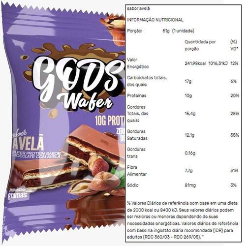 Gods wafer é uma barra de wafer proteica com zero adição de açúcar que chega para surpreender pela qualidade nutricional, sabor e maciez. Sabor dos deusesA mais saborosa do mercado, são 10g de proteína por unidade.2 deliciosos sabores que podem te acompanhar em qualquer momento: na atividade física, no trabalho, no conforto de casa, na correria de uma atividade para outra e onde mais imaginar. Uma forma simples e completa de matar a vontade de um doce sem comprometer a dieta. Perfeita também para ser levada alguns minutos ao microondas e ter uma explosão de sabor e consistência.Benefícios:- 10g de proteína ;- sabor e cremosidade incomparável;- estimula a recuperação e construção muscular;- praticidade;- zero açúcar adicionado;- zero corantes;- processo de filtragem diferenciado que confere textura e qualidade superior;Apresentação:Contém 6 unidades de 51g.