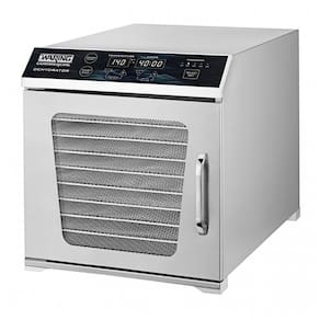 O Waring WDH10 é uma desidratadora de alimentos horizontal countertop com 10 bandejas removíveis de malha inoxidável, oferecendo 1,3 m² de área total de desidratação. Projetado para preservação de frutas, ervas, carnes (jerky), vegetais e ingredientes como kimchi ou fruit leathers, com faixa de temperatura de 32°C a 82°C e timer de 1 a 40 horas.