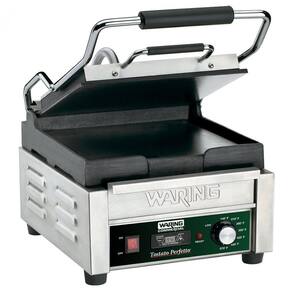 Grelha elétrica profissional com superfície de cozimento de 25 x 23 cm em ferro fundido liso nas placas superior e inferior. Equipada com timer NSF certificado e controle por dial, opera a até 300°C. Placas em ferro fundido distribuem calor de forma homogênea. Compatível com rede elétrica monofásica 110V, 60Hz, 15A e plugue NEMA 5-15P. Uso: dever padrão.Funciona como grill