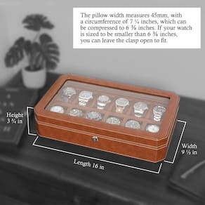 Diga olá ao ápice absoluto da exibição e armazenamento do relógio. A caixa de relógio Rothwell 12 define o padrão de qualidade e é perfeita para mesas de cabeceira, cômoda ou armários. A caixa comporta doze relógios individuais, possui almofadas macias de micro camurça e é larga o suficiente para acomodar uma coleção de relógios grandes. Uma característica única específica da nossa caixa é que usamos divisórias grandes entre os compartimentos do relógio. Isso permite que os relógios tenham amplo espaço entre si para garantir que eles nunca toquem ou sejam arranhados enquanto estiverem dentro. O design elegante apresenta seus relógios premiados, uniformemente espaçados em uma linda caixa de madeira maciça embrulhada em couro. Se você está procurando um presente, não procure mais. Esta caixa é o tamanho perfeito para colecionadores e entusiastas de todas as idades! Tem dúvidas? diretamente pela Amazon ou pelo nosso site! - 12 compartimentos grandes: cada almofada mantém um relógio pequeno ou grande perfeitamente no lugar, até 60 mm um ao lado do outro. Há muito espaço entre a tampa e as almofadas para acomodar relógios de todos os tamanhos. - Presente perfeito: as caixas de relógio Rothwell são presentes perfeitos para o Dia dos Pais, Dia das Mães, aniversários, dia dos namorados, formaturas, feriados, aposentadoria e eventos corporativos. Você certamente encantará até mesmo o destinatário mais difícil de agradar. Nosso design unissex é perfeito para qualquer um dos colecionadores de relógios em sua vida! Ou dê a você mesmo! Seus relógios merecem! - Qualidade incomparável e design sofisticado: nossa caixa apresenta um design exclusivo de meados do século que é a combinação perfeita de classe e funcionalidade. Cada caixa usa uma moldura de madeira envolta em couro sintético de alta qualidade. O interior é coberto por um elegante tecido de micro camurça marrom. - Garantia de 12 meses: Garantimos 100% dos nossos produtos. Se você tiver algum problema dentro do período de 12 meses, e substituiremos sua caixa GRATUITAMENTE. Temos orgulho de nosso excelente atendimento ao cliente e responderemos dentro de 24 horas para resolver quaisquer problemas e obter uma nova caixa o mais rápido possível. - Dimensões: o exterior do nosso porta-joias mede 40,6 cm de comprimento, 24,5 cm de largura e 9,5 cm de altura com um peso de 4,3 kg. A circunferência do travesseiro é de 19 cm e compressível até 16 cm. Se o seu relógio tiver tamanho menor que 16 cm, você pode deixar o fecho aberto para servir.