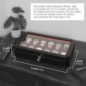 Diga olá ao ápice absoluto da exibição e armazenamento do relógio. A caixa de relógio Rothwell 12 define o padrão de qualidade e é perfeita para mesas de cabeceira, cômoda ou armários. A caixa comporta doze relógios individuais, possui almofadas macias de micro camurça e é larga o suficiente para acomodar uma coleção de relógios grandes. Uma característica única específica da nossa caixa é que usamos divisórias grandes entre os compartimentos do relógio. Isso permite que os relógios tenham amplo espaço entre si para garantir que eles nunca toquem ou sejam arranhados enquanto estiverem dentro. O design elegante apresenta seus relógios premiados, uniformemente espaçados em uma linda caixa de madeira maciça embrulhada em couro. Se você está procurando um presente, não procure mais. Esta caixa é o tamanho perfeito para colecionadores e entusiastas de todas as idades! Tem dúvidas? diretamente pela Amazon ou pelo nosso site! - 12 compartimentos grandes: cada almofada mantém um relógio pequeno ou grande perfeitamente no lugar, até 60 mm um ao lado do outro. Há muito espaço entre a tampa e as almofadas para acomodar relógios de todos os tamanhos. - Presente perfeito: as caixas de relógio Rothwell são presentes perfeitos para o Dia dos Pais, Dia das Mães, aniversários, dia dos namorados, formaturas, feriados, aposentadoria e eventos corporativos. Você certamente encantará até mesmo o destinatário mais difícil de agradar. Nosso design unissex é perfeito para qualquer um dos colecionadores de relógios em sua vida! Ou dê a você mesmo! Seus relógios merecem! - Qualidade incomparável e design sofisticado: nossa caixa apresenta um design exclusivo de meados do século que é a combinação perfeita de classe e funcionalidade. Cada caixa usa uma moldura de madeira envolta em couro sintético de alta qualidade. O interior é coberto por um elegante tecido de micro camurça marrom. Observação: não recomendamos usar nosso interior vermelho com tiras brancas ou de cores claras, a coloração vermelha pode ser transferida com armazenamento prolongado. - Garantia de 12 meses: Garantimos 100% dos nossos produtos. Se você tiver algum problema dentro do período de 12 meses, e substituiremos sua caixa GRATUITAMENTE. Temos orgulho de nosso excelente atendimento ao cliente e responderemos dentro de 24 horas para resolver quaisquer problemas e obter uma nova caixa o mais rápido possível. - Dimensões: o exterior do nosso porta-joias mede 40,6 cm de comprimento, 24,5 cm de largura e 9,5 cm de altura com um peso de 4,3 kg. A circunferência do travesseiro é de 19 cm e compressível até 16 cm. Se o seu relógio tiver tamanho menor que 16 cm, você pode deixar o fecho aberto para servir.