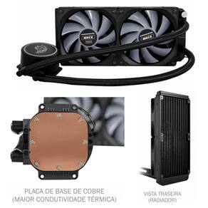 Water Cooler K-Mex WAC6 240mm Intel AMD Led Preto Características: - Marca: Kmex - Modelo: WAC6 - Especificações: - AMD Socket: AM4/AM3+/AM3/AM2+/AM2/FM2/FM1/940/939/754 240w - INTEL Socket: LGA 1700/1200/2066/2011/1151/1150/1156/1155 240w - Dimensões do radiador C x L x A : 275 x 120 x 27 mm - Dimensões do fan C x L x A : 120 x 120 x 25 mm - Dimensões da Bomba C x L x A : 76 x 82 x 40 mm - Cores: - Lâminas: 9 - Conector do fan: 4 PIN - Conector da bomba de refrigeração: 3 PIN - Voltagem do fan: 12 VDC - Voltagem da bomba de refrigeração: 12 VDC - Corrente: 0.6A - Potência de consumo: 7.2W - Velocidade do fan: 800-1800RPM+-10% - Corrente de ar: 68CFM - Ruído: 35 dB A - Tipo de rolamento: Hydro Bearing - Comprimento do cabo do fan: +-400mm - Comprimento do cabo da bomba de refrigeração: +-300mm Marca: Não Informado