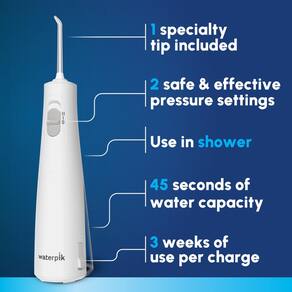 - Liberador de água recarregável: Waterpik Cordless 1100 (WF-30CD) é uma ótima escolha para uso portátil de fio dental, viagens e casa. Inclui a ponta Waterpik Precision clinicamente comprovada para uso diário, uma bateria recarregável e pode ser usada no chuveiro.