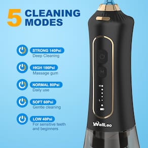 Especificações: 1. Valor direto da fábrica. A WELLLEO oferece irrigadores dentais de água de alta qualidade a preços imbatíveis, direto da fábrica para você. 2. Inovação focada no cliente Ouvimos seus comentários para melhorar constantemente nossos produtos, proporcionando uma experiência melhor sempre. 3. Design inteligente, fácil manutenção Os irrigadores dentais WELLLEO apresentam uma bola gravitacional patenteada para limpeza em ângulo total, uma aderência ergonômica para conforto, tablets de limpeza e uma escova para fácil manutenção e uma poderosa pressão de água de 40 a 140 psi para resultados eficazes. - Forte fluxo de água pulsante, limpeza profunda - recomendado por dentistas: o irrigador bucal de água fornece 1300 pulsos por minuto para remover efetivamente detritos persistentes e partículas de alimentos dos dentes e gengivas. Com cinco modos de limpeza ajustáveis, o fio dental atende às necessidades individuais. Seja para usuários iniciantes, gengivas sensíveis ou para aqueles com aparelhos, passando por ortodontia ou precisando de limpeza periodontal profunda, este é o dispositivo ideal para chuveiro oral endossado por dentistas - Bateria de longa duração - 30 dias de uso: este irrigador dental possui uma bateria recarregável de 2500 mAh que dura até 30 dias com uma única carga, eliminando a necessidade de recarga frequente. Com uma porta de carregamento USB-C e indicador de bateria (adaptador não incluído), o fio dental hidro permite o carregamento fácil usando um carregador de telefone, carregador portátil ou computador. Seu design compacto e potência de longa duração o tornam ideal para viagens e viagens de negócios - Reservatório grande de 300 ml - sem necessidade de recargas frequentes: este irrigador bucal de jato de água possui um reservatório de grande capacidade de 300 ml, fornecendo água suficiente para uma limpeza completa sem a necessidade de recargas frequentes. O reservatório é fácil de retirar para uma limpeza abrangente. Seu design compacto o torna portátil, garantindo que você possa desfrutar de dentes frescos e saudáveis em casa ou em movimento - À prova d'água IPX7 – Seguro para uso no banheiro: o design IPX7 à prova d'água mantém a umidade fora, para que você possa usar facilmente o irrigador bucal dental no banheiro sem se preocupar com respingos danificá-lo. É seguro de usar durante o banho, oferecendo cuidados bucais convenientes. Observação: Sempre feche a tampa à prova d'água na porta de carregamento durante o uso para evitar a entrada de água, garantindo que o fio dental dure mais tempo - Modo de memória inteligente com proteção contra superaquecimento (temporizador de 2 minutos): Este irrigador bucal elétrico se lembra automaticamente da última intensidade do fluxo de água usada e do modo de limpeza, eliminando a necessidade de reajustes e tornando a higiene bucal mais eficiente. O temporizador de 2 minutos garante que você conclua sua limpeza dentro do tempo recomendado para melhores resultados. Se a temperatura exceder os níveis seguros, o sistema de proteção contra superaquecimento cortará a energia para segurança. O irrigador dental pode ser utilizado novamente quando esfriar - Para ocasiões especiais, fácil de usar: este irrigador oral vem com uma garantia de 12 meses e suporte por e-mail 24 horas por dia, 7 dias por semana para garantir a satisfação do usuário. É uma excelente escolha para amigos, familiares e entes queridos, perfeita para ocasiões especiais como aniversários, Natal, Dia de Ação de Graças, Dia dos Namorados, Dia dos Pais ou Dia das Mães. O que você receberá: 1 x irrigador bucal de água, 5 x bocais (substituição recomendada a cada 3 meses), 1 x cabo USB-C e 1 x manual do usuário (sem garantia de versão em português)