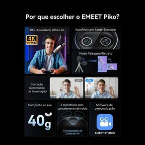 Webcam emeet piko+ 4k ultra hd com dupla câmera e ia Imagem - resolução 4k ultra hd 38402160 a 30 fps com sensor sony de alta qualidade - dupla câmera com inteligência artificial para foco rápido e ajuste automático de luz - zoom digital de 1.5 e ângulo de visão amplo 73 Áudio de alta qualidade - 3 microfones embutidos com redução de ruído - captação clara mesmo em ambientes barulhentos Design funcional e moderno - tampa de privacidade magnética com tema de panda - estrutura compacta e elegante, fácil de transportar - montagem ajustável e cabo de 1,5m incluso Compatibilidade - funciona em windows e macos plug & play via usb-c ou adaptador usb-a - compatível com obs, twitch, youtube, zoom, teams, google meet e muito mais - inclui software emeetstudio para controle de câmeras, atalhos e mixagem de áudio Conteúdo da caixa 1x webcam emeet piko+ 4k 1x cabo usb-c 1,5m 1x adaptador usb-a 1x tampa de privacidade magnética Ideal para: lives, videochamadas profissionais, criação de conteúdo, aulas online e streaming. Marca: Não Informado