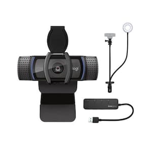 Vídeo HD em 1920 x 1080 Taxa de quadros de vídeo de até 30 fps Resolução de imagem estática de até 10 MP O sensor CMOS oferece imagens nítidas e claras Foco automático em HD e correção de luz Campo de visão de 78 graus Quadros 2 pessoas lado a lado 2 microfones embutidos capturam áudio Conecta-se à porta USB 2.0 do seu PC com cabo de 5 pés Vem com um suporte de webcam com seletor 2 em 1 Luz de anel para festas
