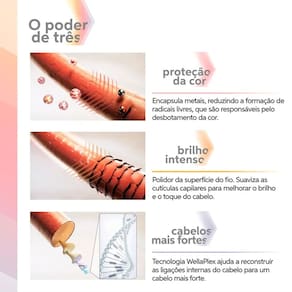 Ingredientes Principais: Tecnologia WellaPlex (reconstrói ligações internas dos fios), agentes antioxidantes (proteção contra radicais livres), ingredientes condicionantes para suavizar cutículas.