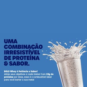 Bold Whey Protein Cookies & Cream 450g - Proteína real, sabor surreal O sabor clássico reinventado em uma versão cremosa e nutritiva. O BOLD Whey Protein Cookies & Cream 450g é ideal para quem busca um whey versátil e saboroso. Com 22g de proteína por porção de 30g, combina whey concentrado, isolado e hidrolisado em um blend de alta qualidade, garantindo rápida absorção e excelente valor nutricional. Com o sabor marcante de cookies com creme e uma textura cremosa irresistível, é perfeito para shakes pós-treino, lanches práticos ou até mesmo como ingrediente em receitas como bolos, panquecas e sobremesas fitness. Destaques do Produto - 22g de proteína por porção 30g - Blend de whey concentrado, isolado e hidrolisado - Textura cremosa e fácil preparo - Sabor marcante de cookies com creme - Embalagem prática de 450g - Qualidade e inovação BOLD Ingredientes Proteína de soro do leite concentrada, proteína isolada do soro do leite, proteína hidrolisada do soro do leite, biscoito triturado de cacau sem açúcar, aromatizantes, espessantes goma guar e goma xantana e edulcorante sucralose. Informações para Alérgicos Contém derivados de leite. Pode conter amêndoa, amendoim, avelãs, castanha-de-caju, castanha-do-pará e soja. Contém lactose. Contém glúten. Sugestão de Consumo Consumir até 2 porções ao dia, diluindo 30g em 200ml de água ou leite, ou conforme orientação . Modo de Armazenar Conservar em local fresco, seco e ao abrigo da luz. Após aberto, consumir em até 180 dias e manter a embalagem bem fechada.