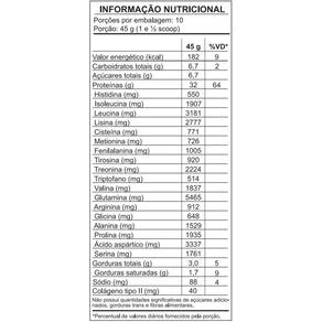 Proteína de soro do leite concentrada WPC , proteína de soro do leite isolada WPI , proteína de soro do leite hidrolisada WPH , colágeno tipo II, aromatizante idêntico ao natural, edulcorante: glicosídeos de esteviol e antiumectante dióxido de silício.