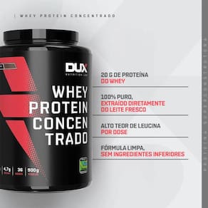 WHEY PROTEIN CONCENTRADO (900g) - DUX NUTRITION O Whey Protein Concentrado Dux Nutriton é composto por proteínas de alto valor biológico e rápida absorção, além de gorduras essenciais, carboidratos e uma ampla gama de aminoácidos, fundamentais para garantir a síntese muscular acelerada após a prática de esportes. É ideal para ser consumido antes e depois de treinos, mas também pode fazer parte do café da manhã ou servir como um lanche entre as refeições, e em outros momentos conforme a orientação do seu nutricionista. BENEFÍCIOS O nome diz tudo: Whey Protein Concentrado 100% puro, com transparência total, do nome do produto à lista de ingredientes; Não contém goma xantana, complexos vitamínicos à base de maltodextrina, espessantes, estabilizantes, conservantes ou qualquer outro ingrediente inferior; Contém corantes 100% naturais, sem ingredientes artificiais; O nome diz tudo: Whey Protein Concentrado 100% puro, com transparência total, do nome do produto à lista de ingredientes; Matéria-prima premium importada, com alto teor de leucina, desenvolvida para criar um produto com sabor real e marcante; Valores nutricionais robustos, sem excessos, com quantidades ideais de carboidratos e gorduras do leite; Perfil de aminoácidos imbatível: 5g de BCAAs, 4,3g de glutamina e 2,5g de leucina, por dose; 20g de proteína; Não contém goma xantana, complexos vitamínicos à base de maltodextrina, espessantes, estabilizantes, conservantes ou qualquer outro ingrediente inferior; Contém corantes 100% naturais, sem ingredientes artificiais;> Proteína moderna, desenvolvida por especialistas para atletas de esportes de performance (bodybuilding, crossfit e artes marciais), pessoas que buscam uma proteína com baixa caloria (para snacks fit e receitas sem culpa) e pessoas que buscam uma proteína ultrapura de altíssima qualidade.