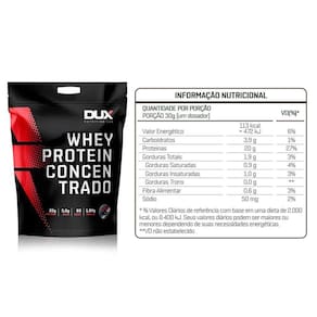 Descrição:Whey protein concentrado - dux nutrition lab: é o suplemento ideal para a auxiliar na manutenção e no ganho de massa muscular, proporcionando o suporte que o seu corpo precisa para alcançar uma alta performance. Whey protein concentrado - dux nutrition lab: o whey protein concentrado dux® é composto por proteínas de alto valor biológico e rápida absorção, além de gorduras essenciais, carboidratos e uma ampla gama de aminoácidos, fundamentais para garantir a síntese muscular acelerada após a prática de esportes.É ideal para ser consumido antes e depois de treinos, mas também pode fazer parte do café da manhã ou servir como um lanche entre as refeições, e em outros momentos conforme a orientação do seu nutricionista. Benefícios:- 22g de proteínas- 4,7 g de bcaas;- 2,2 g de leucina;- 3,5g de carboidratos;- 2,6g de gorduras totais. Sugestão de uso:Fornecedor recomenda misturar cada medida em 250-350ml de aguá e misturar.Este produto é dispensado de registro na Anvisa de acordo com a RDC número 27 de 2010.