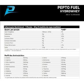 -25 g de whey protein hidrolisado por porção:pepto fuel® é um whey protein hidrolisado a partir do whey protein isolado, que fornece 99% de absorção pelo organismo. -Hidrólise: a hidrólise é um método de filtragem que permite que as moléculas de proteína sejam quebradas em cadeias menores, o que torna o pepto fuel® um whey com 99% de biodisponibilidade protéica, a mais nobre apresentação desta proteína. O pepto fuel combate a sarcopenia,a perda de massa magra em idosos e é importante na recuperação pós cirúrgica. -0 g de carboidratos: por se tratar de uma proteína de alto valor biológico, pepto fuel® não possui 1 grama de carboidrato e é isento de lactose. -7 g de bcaas: por uma ocorrência natural da proteína, pepto fuel® possui 7 g de bcaa's. -Uso sugerido: Misture uma porção 1 medida do copo medidor de pepto fuel® em 230 ml de água ou leite desnatado. Consumir uma porção diariamente ou conforme a recomendação de um nutricionista e/ou médico nutrólogo. -Sabor:baunilha. -Não contém glúten. -Não contém carboidrato. -Não contém lactose. -Embalagem: 909 g 2lbs . -Validade: 24 meses da fabricação. Ean: 7898315580842