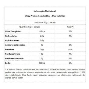 Whey Protein Isolado Display - Sabor: Cappuccino 10 unid. 30g Whey Protein Isolado Display O Whey Protein Isolado Dux Nutrition possui baixo teor de gorduras e carboidratos, sendo ideal para construção e recuperação muscular sem perda de definição, como um snack fit prático ou sem culpa em suas receitas. Uma proteína 100% pura, duplamente filtrada, sem adição de outro tipo de Whey ou de proteínas inferiores. Se há um nutriente indispensável, é a proteína. Ela é feita de aminoácidos, que são os blocos de construção do nosso corpo. A proteína do soro do leite, em inglês Whey Protein, é uma das fontes de aminoácidos de melhor absorção, maior até que o frango ou peixe. Isso torna o Whey uma forma conveniente de ingerir proteína, melhorando a saúde, o bem-estar e os resultados dos treinos. BENEFÍCIOS: Matéria-prima premium importada, obtida através do processo de extração de microfiltragem, sem renunciar do sabor real das nossas proteínas; Aporte completo de aminoácidos: 6,2g de BCAAs; 4,7g de glutamina e 2,9g de leucina, por dose; 24g de proteína; Disponível em versões sem adoçantes artificiais, 100% naturais; O nome diz tudo: Whey Protein Isolado 100% puro, com transparência total, do nome do produto à lista de ingredientes; Não contém goma xantana, complexos vitamínicos à base de maltodextrina, espessantes, estabilizantes, conservantes ou qualquer outro ingrediente inferior; Proteína moderna, desenvolvida por especialistas para atletas de esportes de performance bodybuilding, treinamento funcional e artes marciais , pessoas que buscam uma proteína com baixa caloria para snacks fit e receitas sem culpa e pessoas que buscam uma proteína ultrapura de altíssima qualidade; Contém corantes 100% naturais, sem ingredientes artificiais.