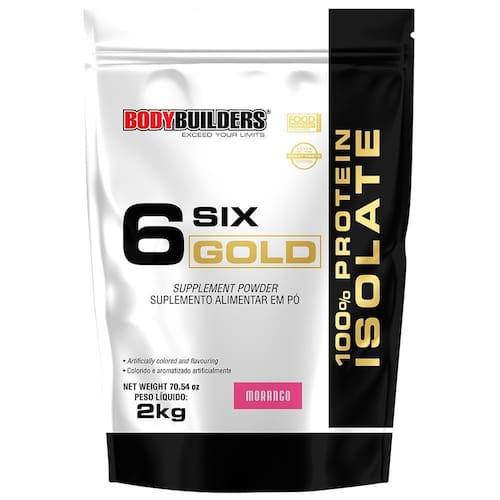 Whey Protein Isolado Six Gold 2 Kg Exclusivo - Bodybuilders Sabor: Morango A 6 Six Gold é um blend que reúne as principais fontes de proteínas que o organismo necessita. Com a combinação de proteínas hidrolisadas e isoladas do soro de leite, proteína premium isolada da soja, proteína isolada da carne, o suplemento Six Gold 100% Protein Isolate auxilia no favorecimento do ganho de massa magra e definição muscular, garantindo mais disposição e força durante os treinos e proporcionando excelentes resultados.