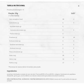 Ingredientes: proteínas hidrolisada e isolada do soro de leite thermax690 e provon292 , colágeno hidrolisado em peptídeos peptan , goma guar, aroma idêntico ao natural e edulcorante glicosídeos de esteviol estévia . Não contém glúten.