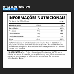 Tabela nutricional: wheyzero 3vs - sabor chocolate (900g) Porção de 30g (1 medidor) Carboidratos 3,2g Proteínas 21g Gorduras totais 2,3g Gorduras saturadas 1g Sódio 51mg Tabela nutricional: wheyzero 3vs - sabor baunilha (900g) porção de 30g (1 medidor) Carboidratos 4g Proteínas 21g Gorduras totais 2,1g Gorduras saturadas 0,9g Sódio 46mg Não contém quantidades significativas de gorduras trans e fibra alimentar.