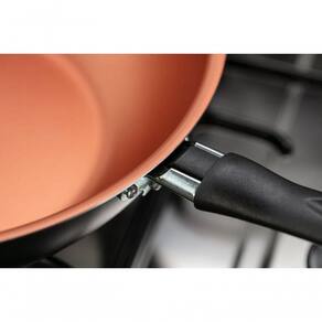 Característica-1 - DIFERENCIAIS: a Panela Wok 26 cm Topázio/Brinox tem estrutura de alumínio que distribui o calor de forma homogênea e garante o cozimento mais rápido. O cabo em baquelite não esquenta e proporciona um toque confortável e ergonômico. O revestimento Pro-flon é um antiaderente que reduz a necessidade do uso de óleo no preparo de alimentos, evita que eles grudem e facilita a limpeza, além de ser PFOA Free.