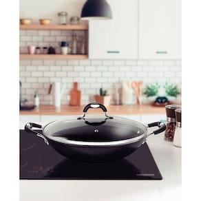 INFORMAÇÕES GERAIS DA PANELA WOK TRAMONTINA INDUCTION EM ALUMÍNIO PRETO COM ANTIADERENTE E TAMPA DE VIDRO - Corpo de alumínio com espessura de 3,0 mm que proporciona cozimento rápido e uniforme. - Revestimento interno e externo de antiaderente Starflon Premium que não gruda, é fácil de limpar, mais durável e não é prejudicial a saúde. - Tampa de vidro temperado com borda de aço inox e saída de vapor. - Alças e pegadores metálicos com proteção de silicone que proporciona redução da propagação de calor, aumentando a segurança e melhorando a empunhadura. - Podem ir à máquina de lavar louças facilitando seu dia a dia.