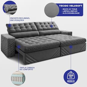 Sofá Retrátil e Reclinável 3,00m Molas Ensacadas Max Spring. Velusoft Cama inBox