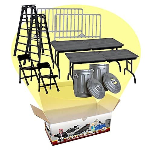 Wrestling Figure Gear Special Deal # 2 vem com os seguintes itens: (2 mesas quebráveis, 2 escadas, 2 cadeiras, 2 trilhos de controle de multidões e 2 latas de lixo com tampas)