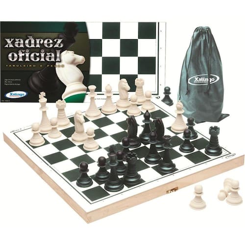 O Xadrez com peças oficias Xalingo foi especialmente desenvolvido para os apaixonados por jogos de tabuleiro. Com peças plásticas chumbadas e com ótimo acabamento, acompanha feltro para aplicação e proteção do tabuleiro e saco para proteção e tranporte das peças. Tabuleiro confeccionado em madeira reflorestada, com tinta atóxica e dobradiça metálica garantem a qualidade do produto. Tabuleiro medindo 40 x 40 cm, com casa de 5 cm e Rei com 10 cm. Indicado para crianças acima de 7 anos.