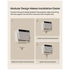 O sistema modular utiliza um gimbal de engate rápido que é conectado ao projetor e, em seguida, acoplado à haste de sustentação com travamento por torção simples. Dessa forma, o usuário consegue montar, posicionar ou reposicionar o suporte sem necessidade de ferramentas complexas. A estrutura suporta cargas de até 5,5 kg, atendendo com folga o peso típico dos projetores da série HORIZON S.
