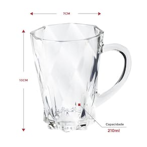 - Medidas xícara: 7 x 10 x 7 CM largura x altura x diâmetro - Capacidade 210ml - Confeccionada em vidro resistente - Kit com 6 Peças Ean: 789976669168