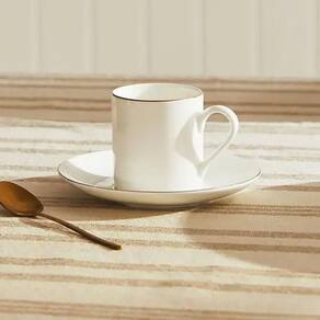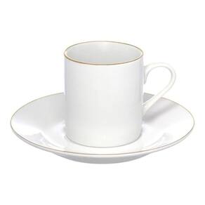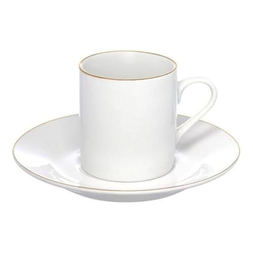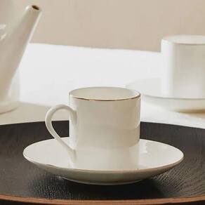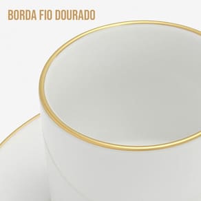 Conjunto para servir café composto por xícara de 90ml e pires, ambos fabricados em porcelana. A porcelana oferece resistência a variações térmicas, permitindo o uso com bebidas quentes e facilitando a higienização. A pintura dourada na borda da xícara e do pires adiciona uma camada protetiva, reduzindo o desgaste nessas áreas de contato.