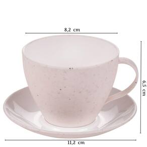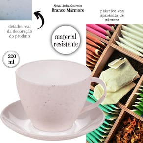 Xícara de plástico com pires para servir café e chá, com decoração predominantemente branca com leves traços/ranhuras pretas por toda a peça, que traz uma aparência marmorizada super requintada ao produto.