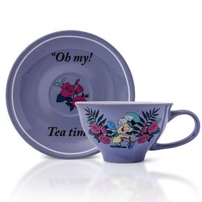- Xícara de chá e pires: Prepare-se para sua próxima festa de chá com este conjunto de xícara de chá e pires que apresenta Alice e o Chapeleiro Maluco cercados de flores na xícara de chá, e as palavras "Oh meu! Hora do chá!" no pires