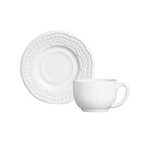ESPECIFICAÇÕES TÉCNICASMarcaPorto Brasil CerâmicaColeçãoRavennaLinhaMadeleine BrancoMaterialCerâmica FeldspáticaCor Predominante da BaseBrancoComposição6 Xícaras de Chá e 6 Pires de CháDimensões do ProdutoXícara de Chá Ø 8cm A = 6cm V = 161ml/ Pires de Chá Ø 14 cm A= 1,5 cmDimensões da EmbalagemC=32,1cm x L=17,8cm x A=13,7cmPeso da Embalagem2,38 kgTipo de embalagemCaixa pardaUSO E CUIDADOUsoPode ser utilizado em micro-ondas e lava-louças. Não é recomendado usar no forno convencional.LimpezaA limpeza das peças é fácil e prática. É recomendado utilizar sabão, detergente e uma esponja macia.CuidadosEsmaltes cerâmicos possuem dureza superior a maioria dos metais utilizados na fabricação de talheres. Por isto, toda vez que um talher produzido com metal de baixa dureza for utilizado em produtos cerâmicos ou de porcelana, sofrerá um desgaste sobre a peça. O que ocorre não é um risco e sim um desgaste do metal sobre a peça. Se isto ocorrer, basta deixar a peça de molho no vinagre ou produtos que possuem saponáceo. Depois enxágue em água abundante e lave com esponja e detergente.INFORMAÇÕES COMPLEMENTARESPodem ocorrer pequenas variações de cor, peso, nuance, brilho, textura e tamanho das peças, em função de fatores relacionados ao processo de transformação de matérias primas naturais e variações existentes nas etapas de conformação, decoração e queima.Nas peças coloridas com relevo da Porto Brasil, aplicamos uma técnica a qual chamamos de Celadon. É um efeito que ocorre no processo de queima do produto, deixando-as com um contraste natural de tonalidades de cores entre as áreas com e sem relevo. O intuito desse efeito é ressaltar as áreas com relevo das peças, acentuando ainda mais esses finos detalhes e as suas texturas, proporcionando assim, sofisticação e diferenciação de acabamento do produto.