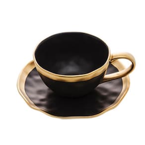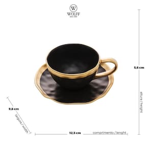 A xícara para chá é produzida em porcelana e fornecida juntamente ao pires que se destaca pelo dourado marcante e borda semi irregular que acrescenta o efeito de ondulações.