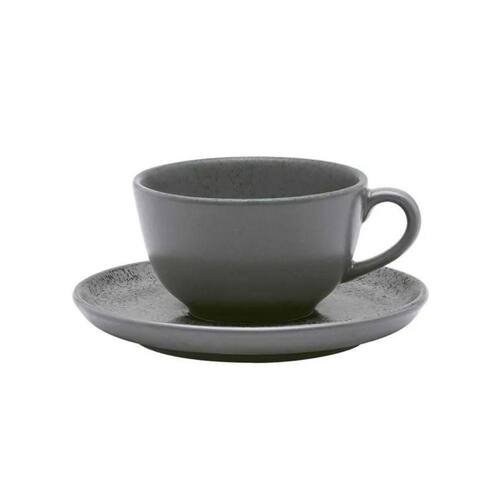 Adicione um toque sofisticado ao seu chá com a xícara e pires em cerâmica Gray Oxford. Seu acabamento acetinado em cinza e detalhes pretos evocam a elegância natural do granito.
