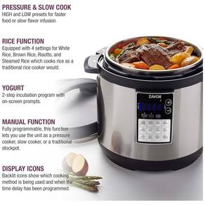 A Panela Elétrica Multifuncional Zavor LUX Edge oferece incrível versatilidade em um único aparelho. Com funções de pressão alta e baixa, cozimento lento, preparo de arroz branco, arroz integral, risoto, cozimento a vapor, iogurte, legumes, sopas, assados, carnes, aves, feijão, sobremesas, aveia, refogar, dourar, manter quente e programação de tempo para o cozimento ideal. Equipada com 4 ajustes diferentes para o cozimento de arroz branco, arroz integral, risoto e cozimento a vapor. A função de cozimento a vapor preserva os nutrientes dos alimentos. Possui função manual que permite usar como panela de pressão, panela de cozimento lento ou panela tradicional. Você pode preparar iogurte caseiro em um simples processo de 2 etapas. O recurso de manter quente garante que a comida permaneça aquecida até desligar. Permite programar um atraso de até 6 horas. Ícones retroiluminados no painel indicam o método de cozimento em uso. Possui função de mudo para programação silenciosa. Aprovada pelo ETL. A Panela Multifuncional não abre se estiver travada ou sob pressão. O potente elemento de aquecimento permite que a panela atinja pressão/temperatura mais rapidamente. A Panela de 7,57 Litros usa 1300 watts. Inclui uma panela removível de aço inoxidável resistente à lava-louças livre de PFOA e PTFE, uma grelha de aço inoxidável, um guia rápido, um manual do usuário e um livro de receitas digitais com mais de 120 receitas.