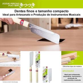 O Serrote Japones Dozuki Panel Piercing P150 P1.41 é um serrote compacto e de dentes finos. Esta versão é ideal para ser utilizada na restauração de móveis, trabalhos precisos sobre laminado, madeira maciça ou produção de instrumentos musicais. Este serrote é denominado piercing pois é capaz de começar um corte a partir do meio da peça, graças ao dente especial no inicio da lâmina. Todos os dentes da linha Z-Saw são endurecidos através do Hard Impulse, tratamento que eleva o grau de dureza do aço ao nível HV800-950 64.0 - 68.2 HRC , que é a dureza máxima que o aço pode alcançar, o que confere ao serrote um excelente desempenho de corte. O cabo em madeira envolto em ratan. Especificações: Comprimento do cabo: 190 mm, Comprimento: 150 mm, Comprimento Total: Aproximadamente 375mm, Pitch entre dentes : 1,41 mm, Espessura: 0,30 mm, Kerf espessura de corte : 0,49mm. Tratamento de superfície: Cobertura de óleo; Lâmina de reposição: ref. 7102. Origem : Japão Marca: Zet-Saw Ean: 4963041071018