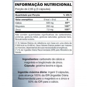 A porção de 3 cápsulas deste produto alcança 100% da IDR (Ingestão Diária Recomendada) para o magnésio e o zinco e 50% da IDR para o cálcio.